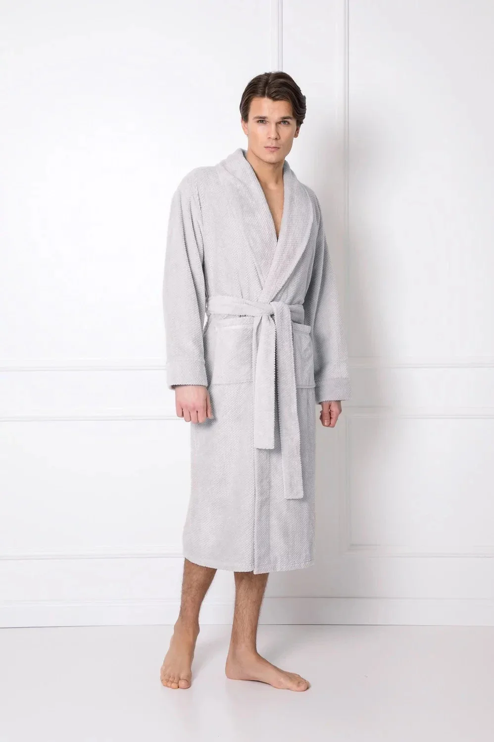 Pánský župan, který je vyrobený z měkké tkaniny s vytlačovaným drobným károvaným vzorem.