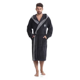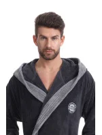 Pánský župan klasického střihu George L&L - na hrudi má malou nášivku - grafitová barva s šedým lemováním - bez zapínání, zavazuje se v pase páskem - na bocích jsou našité kapsy - s kapucí