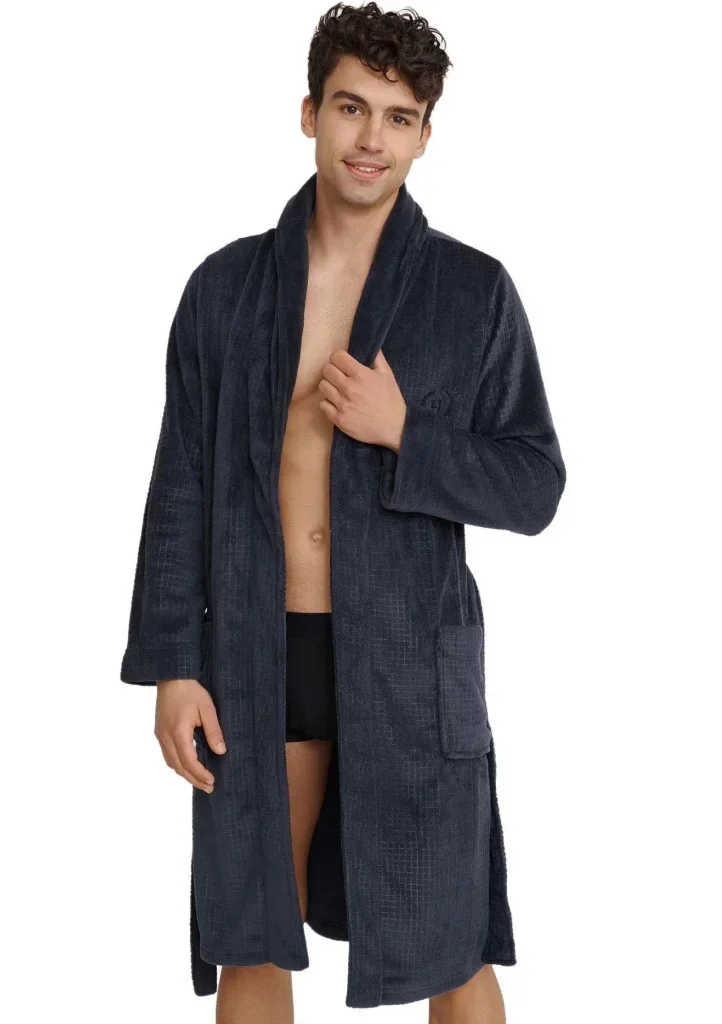 Hřejivý pánský župan od značky Henderson. Je jemný a pohodlný. Župan má šálový límec, na hrudi elegantní výšivku a v pase je na utažení. Po celé ploše má vzor malých kosteček. Délka sahá po kolena. Po stranách má dvě kapsy.