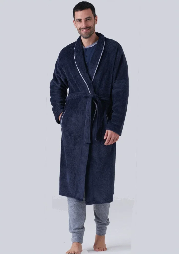 Hřejivý pánský župan od značky Karelpiu. Župan má šálový límec a v pase je na utažení páskem. Délka sahá pod kolena. Po stranách má dvě kapsy. Límec a kapsy jsou olemovány barevným páskem.