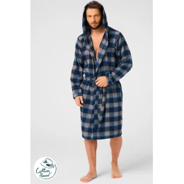 Pánský župan MGL 431 B25 je dokonalou kombinací pohodlí a elegance v domáckém stylu. Je vyroben z měkkého měkkého kostkovaného úpletu, dokonale obepíná tělo a poskytuje teplo v chladnějších dnech. Klasický šálový límec mu dodává elegantní, nadčasový vzhled, zatímco praktické kapsy na bocích mu dodávají funkčnost. Zavazování v pase umožňuje dokonalé přizpůsobení a pohodlné nošení. Jedná se o župan, který bude ideální pro ranní kávu i večerní domácí relaxaci.