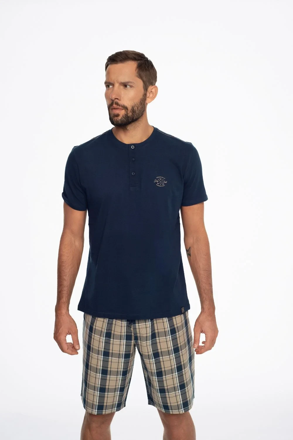 Pánské pyžamo z vysoce kvalitní bavlny. Jednobarevné tričko s krátkým rukávem. Doplněno krátkými kostkovanými kalhotami. V pase guma a šňůrka na stažení pro úpravu obvodu.