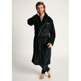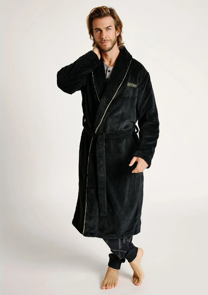Pánský župan Muydemi v černé barvě je vyroben z měkkého a hřejivého materiálu, který poskytuje maximální pohodlí při domácím odpočinku. Zdobí ho decentní geometrický vzor v reliéfu a kontrastní žluté lemování na límci, které dodává moderní vzhled. Župan má praktický střih se šálovým límcem, dvěma kapsami a páskem v pase pro snadné zavazování. Na hrudi je vyšité logo MDM. Ideální volba pro muže, kteří hledají spojení elegance, komfortu a funkčnosti.