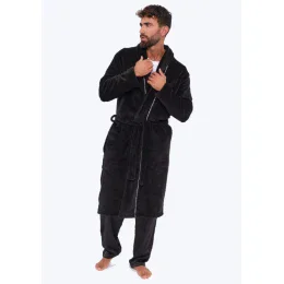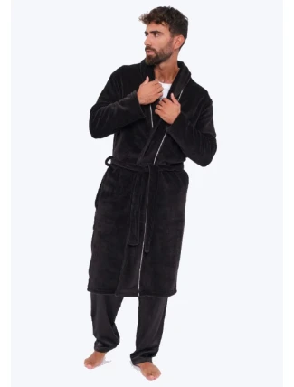 Pánský župan Muydemi v černé barvě je vyroben z měkkého a hřejivého materiálu, který poskytuje maximální pohodlí při domácím odpočinku. Zdobí ho decentní geometrický vzor v reliéfu a kontrastní žluté lemování na límci, které dodává moderní vzhled. Župan má praktický střih se šálovým límcem, dvěma kapsami a páskem v pase pro snadné zavazování. Na hrudi je vyšité logo MDM. Ideální volba pro muže, kteří hledají spojení elegance, komfortu a funkčnosti.