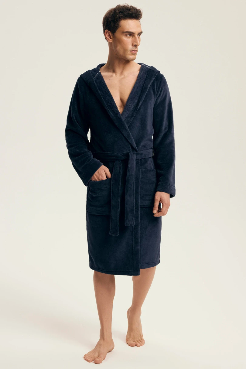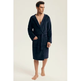 Szlafrok męski NAPS 43374 AW25 to doskonały wybór dla mężczyzn ceniących minimalistyczny design i codzienną wygodę. Wykonany z miękkiego i przyjemnego w dotyku materiału, idealnie sprawdza się w chłodne poranki, po kąpieli lub wieczorem przy domowym relaksie. Klasyczny, jednolity granatowy kolor nadaje mu ponadczasowego stylu. Szlafrok wyposażono w praktyczny kaptur, kieszenie i pasek, co czyni go nie tylko funkcjonalnym, ale i bardzo komfortowym.