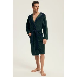 Szlafrok męski NATCH 43377 AW25 to idealne połączenie funkcjonalności i męskiego stylu. Wykonany z miękkiego, ciepłego materiału, zapewnia komfort termiczny nawet w chłodniejsze dni. Model wyróżnia się kontrastowym wykończeniem kaptura i pasa w ciemniejszym odcieniu, co nadaje mu nowoczesny i elegancki charakter. Praktyczny kaptur, dwie pojemne kieszenie oraz pasek w talii sprawiają, że szlafrok doskonale sprawdzi się po kąpieli, rano lub wieczorem. To wygodny, a zarazem stylowy wybór dla każdego mężczyzny.
