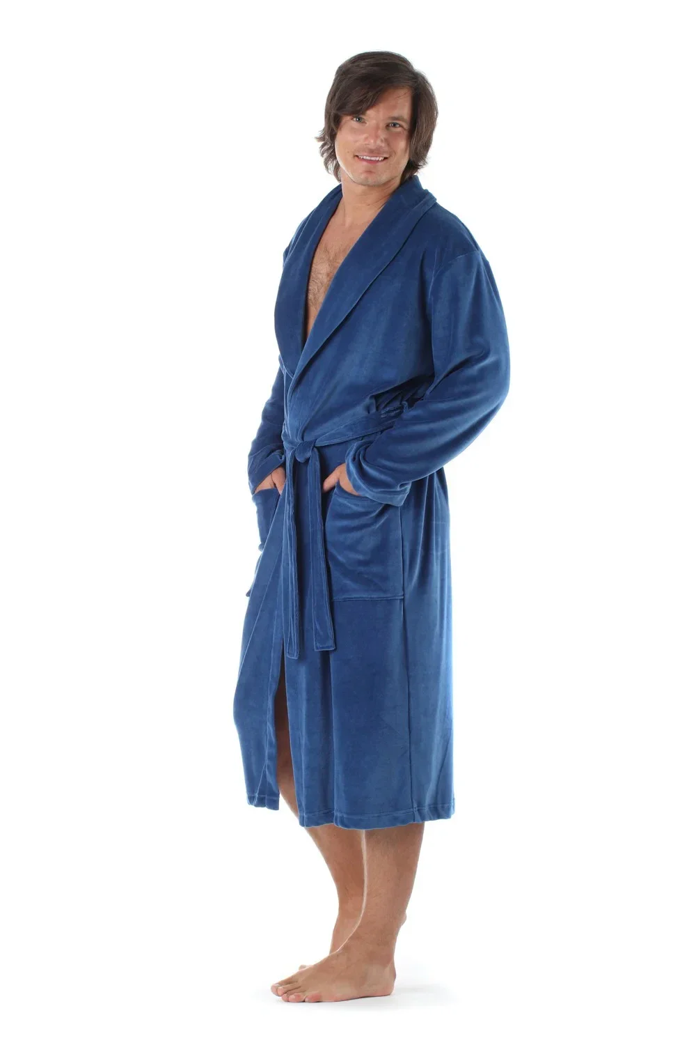 Ideální župan pro domácí relax, večení odpočinek, ale i na cestování nebo do nemocnice. Lehký úpletový sametový velur se přizpůsobí vašim tvarům nijak neomezuje v pohybu. Župan má praktickou délku ke kolenům, dvě prostorné kapsy a pásek na převázání. Šálový límec dává županu elegantní vzhled. Tento klasický župan kombinuje maximální komfort s praktičností a nadčasovým stylem. Při správné péči vám bude sloužit mnoho let.