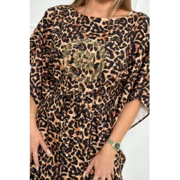 Představujeme vám módní šaty. Šaty mají netopýří rukávy. Módní leopardí potisk. Šaty zavázané v pase. Ideální každodenní poloha. Šaty jsou vyrobeny z vysoce kvalitního materiálu. Velikost je univerzální a vyhovuje dámám, které nosí velikost S, M nebo L.