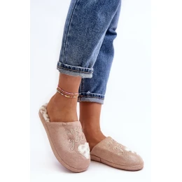 Lesklé dámské pantofle zdobené nápisem a srdcem. Nazouvací model se zakrytým nosem. Osazené na silné podrážce. Stélka podšitá kožešinou.