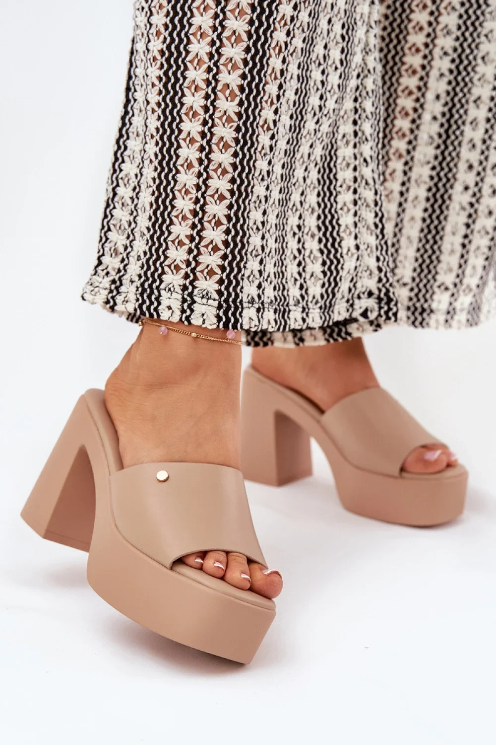 Lehké dámské žabky vyrobené z ekokože. Umístěné na sloupku a platformě. Měkká stélka zajišťuje pohodlí po celý den a pevná konstrukce platformy a podpatku zaručuje stabilitu. Skvělé na teplé dny, tyto žabky budou ideální volbou pro každodenní outfit, kombinující trendy vzhled s funkcionalitou.