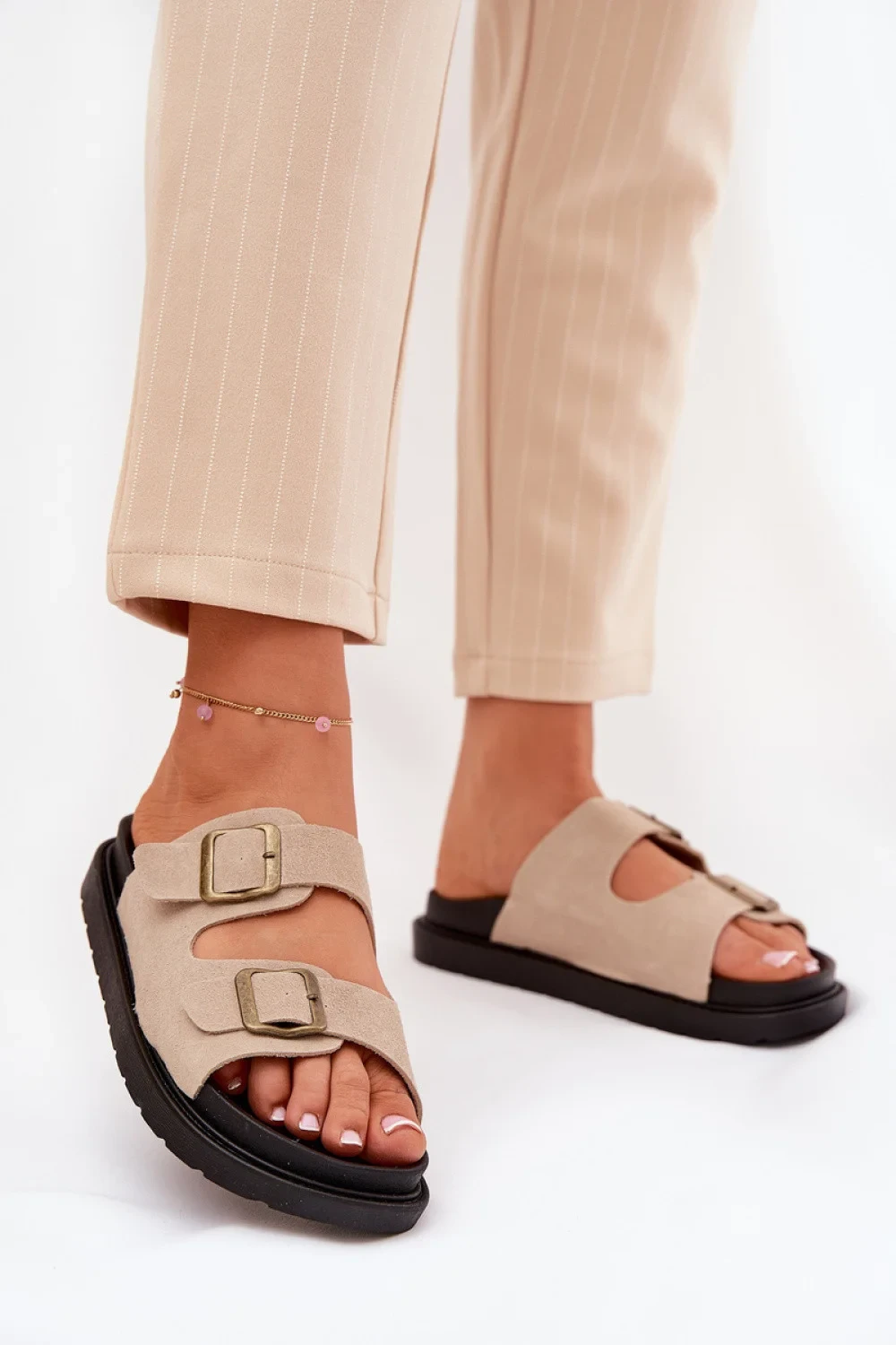 Stylové pantofle vyrobené z ekokože. Umístěné na platformě, která spojuje pohodlí s módním vzhledem. Pásky s přezkami zajistí ideální přizpůsobení a profilovaná vložka zajistí pohodlí po celý den. Tyto pantofle budou skvělou volbou na letní dny, hodí se jak k šatům, tak k kalhotám.