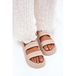 Dámské pantofle vyrobené z lehké pěnové látky, umístěné na platformě, které nabízejí pohodlí po celý den. Dva popruhy vpředu zajišťují stabilitu a jistotu při chůzi. Ideální na horké dny, tyto pantofle jsou skvělou volbou na dovolenou, čas u bazénu nebo na pláži, spojující funkčnost s pohodlím.