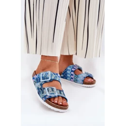 Vzorované dámské pantofle z textilního materiálu na korkové platformě, které spojují pohodlí s módním vzhledem. Dva pásky s ozdobnými sponami zdobenými flitry jim dodávají výjimečný charakter. Profilovaná semišová stélka zajišťuje pohodlí po celý den. Tyto pantofle budou skvělou volbou na letní dny, skvěle ladící s šaty, sukněmi nebo kraťasy, přinášejíc do každého outfitu lehkost a lesk.