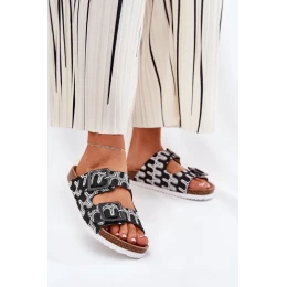 Vzorované dámské pantofle z textilního materiálu, umístěné na korkové platformě, které spojují pohodlí s módním vzhledem. Dva popruhy s přezkami zdobené flitry jim dodávají výjimečný charakter. Tvarovaná semišová stélka poskytuje pohodlí po celý den. Tyto pantofle budou skvělou volbou na letní dny, skvěle ladící s šaty, sukněmi nebo kraťasy, vnášející lehkost a lesk do každého outfitu.