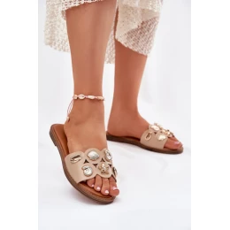Ženské sandály vyrobené z ekokože. Umístěné na plochém podpatku. Model je zdoben zlatými mořskými motivy, které jim dodávají jedinečný charakter. Měkká stélka zajišťuje pohodlí po celý den a jednoduchý, ale stylový design z nich dělá skvělý doplněk k letním outfitům. Ideální na každodenní nošení, kombinují funkčnost s moderním vzhledem.