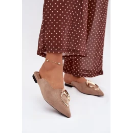 Dámské mule pantofle vyrobené z ekokožešiny jsou stylovým návrhem s elegantním charakterem. Zakryté, špičaté špičky dávají modelu klasický tvar a velký zlatý detail vpředu je efektním doplňkem přitahujícím pozornost. Plochý podpatek zajišťuje pohodlí při nošení. Model skvěle doplní jak elegantní, tak volnočasové outfit.