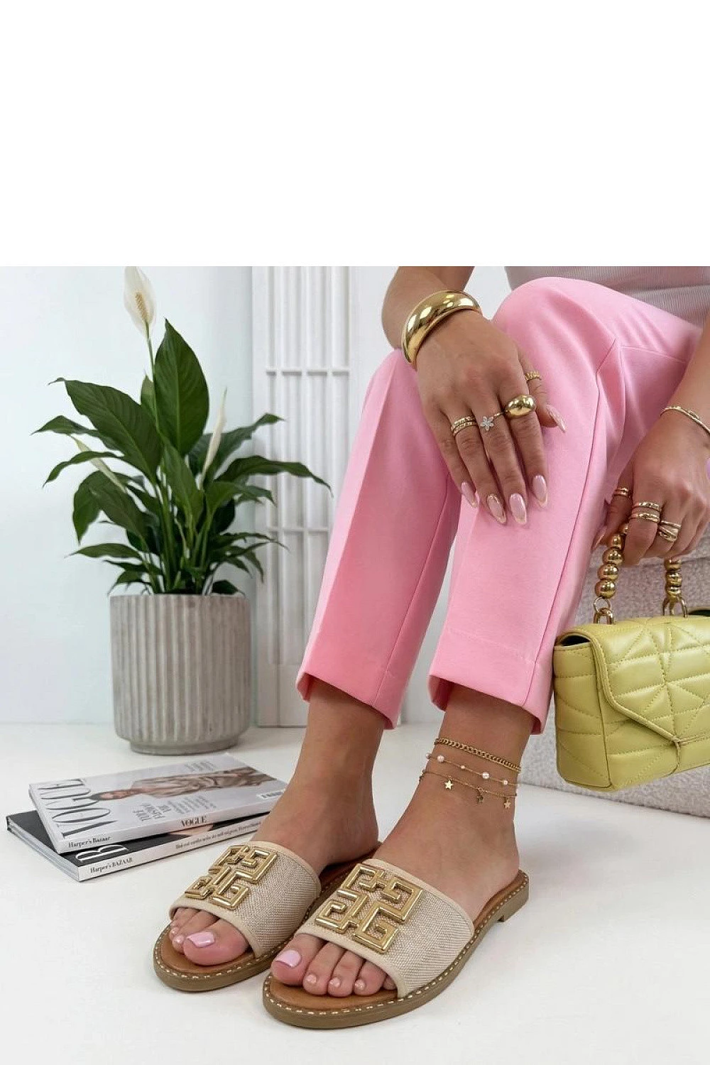 Elegantní žabky s kovovou ozdobou vpředu jsou nabídkou pro ženy, které oceňují spojení pohodlí a stylového vzhledu. Vyrobené z vysoce kvalitního materiálu jsou lehké a pohodlné při každodenním nošení. Nízký podpatek výšky 1,5 cm jemně zdvihne postavu, poskytující stabilitu a pohodlí při chůzi. Zapínání na zástěru usnadňuje rychlé obouvání a dokonale se přizpůsobuje noze. Kovová ozdoba vpředu přidává žabkám eleganci a moderní charakter, činí je univerzální volbou jak na každý den, tak na více příležitostná vycházení.