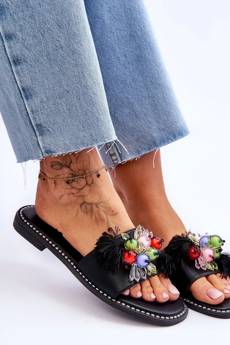 Dámské pantofle jsou vyrobeny z ekologické kůže. Tento model má na přední straně ozdoby v podobě korálků a třásní. Žabky byly nasazeny na plochém podpatku, zatímco podešev zdobily cvočky. Pantofle mají pohodlnou vložku Comfort. Rozhodně byste je měli mít! Při výběru velikosti se řiďte tabulkou velikostí.