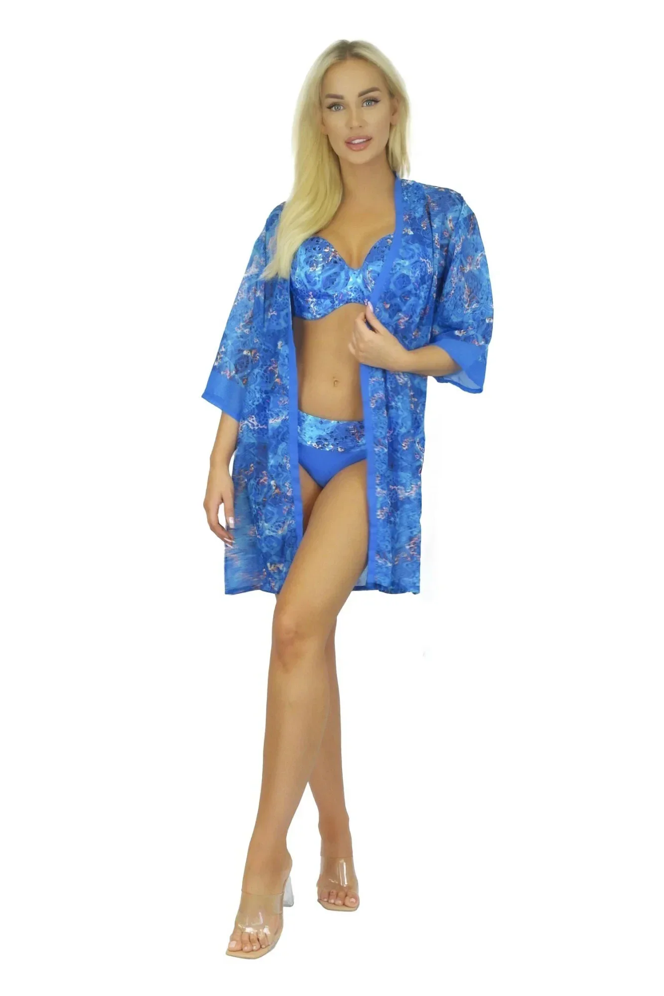 Plážové šaty 11D80SZ 37 SELF - světle modrá barva - z jemné vzdušné látky - se vzorem - tříčtvrteční rukávy - odolné proti UV záření - nemačkavý materiál