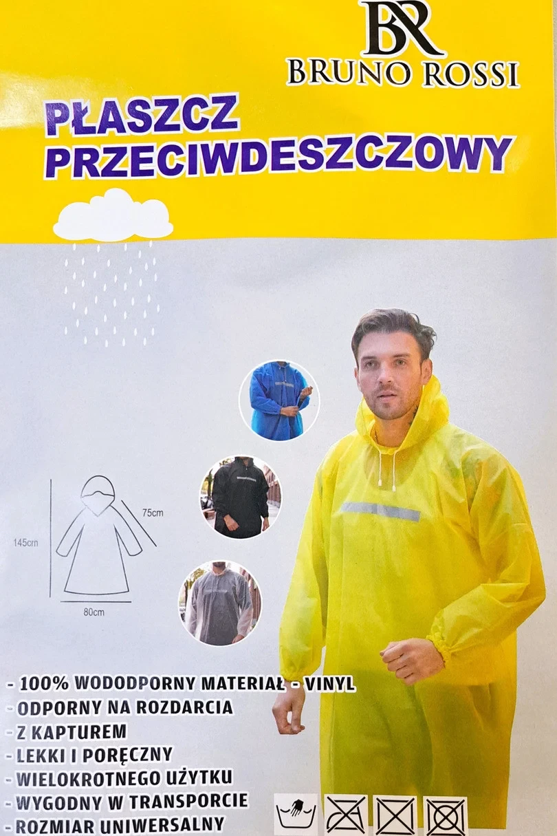Bunda do deště pro dospělé, přes hlavu, s elastickými pásky na rukávech, aby se rukávy oděvu nepromáčely, a se stahovací šňůrkou na kapuci. Má reflexní pruh, abyste byli po západu slunce vidět. 2 * Šířka v podpaží 85 cm, délka od ramene 117 cm