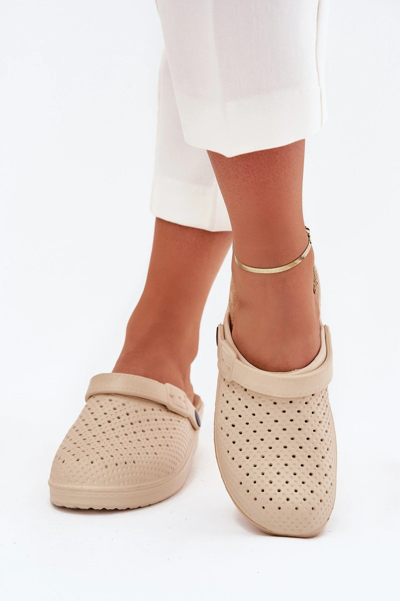 Dámské pantofle z pěnového materiálu, umístěné na jemné platformě. Tento model se vyznačuje pohyblivým páskem, který lze nosit jak na patě, tak vepředu, což umožňuje přizpůsobit boty vlastním preferencím. Zakryté špičky. Lehké a pohodlné, skvěle se hodí k bazénu, na letní dovolené nebo dny strávené na zahradě. Při výběru velikosti se řiďte tabulkou velikostí.