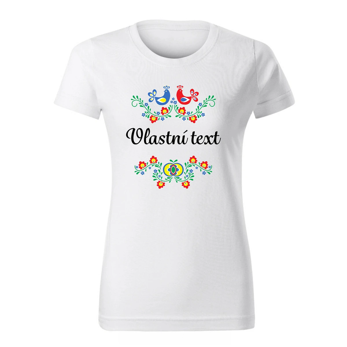 Stylové tričko inspirované moravským folklorem, které kombinuje tradiční lidové ornamenty s možností vlastního textu. Barevný motiv s ptáčky a květinami připomíná klasické lidové výšivky a přináší na tričko kousek moravské tradice.