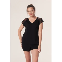Stylowa i niezwykle wygodna piżama damska wykonana z wysokogatunkowej wiskozy to idealne połączenie komfortu i kobiecej elegancji. Miękki, oddychający materiał delikatnie otula ciało, zapewniając swobodę ruchów i przyjemne uczucie podczas snu. Koszulka z krótkim rękawem ma klasyczny dekolt w kształcie litery „V”, który subtelnie podkreśla szyję i dekolt. Krótkie spodenki z elastyczną gumką w pasie gwarantują doskonałe dopasowanie. Zarówno rękawki, jak i nogawki ozdobione są romantycznymi, koronkowymi wstawkami, które dodają całości wyjątkowego, kobiecego charakteru. Piżama pakowana jest w eleganckie pudełko – idealna na prezent dla każdej kobiety.
