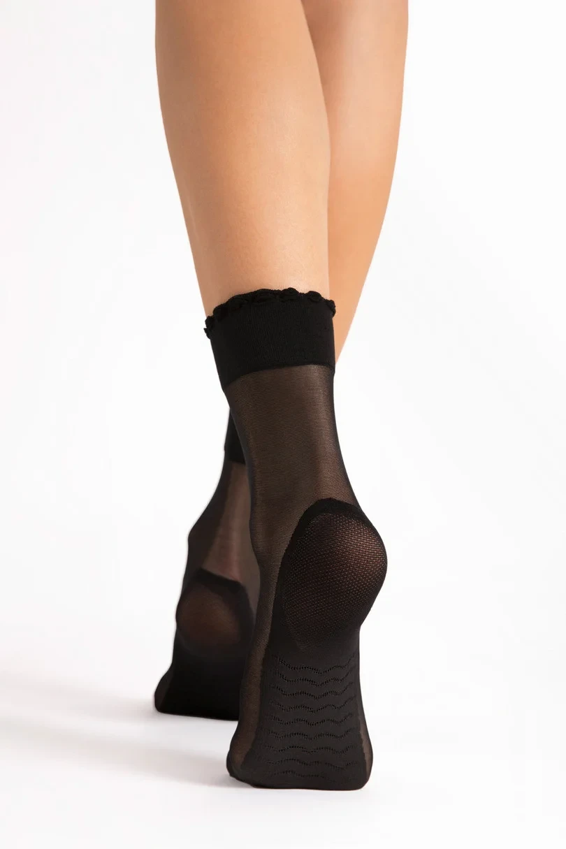 Ponožky Pico Massage 20 denier od společnosti Fiore jsou elegantním a funkčním doplňkem, který spojuje styl s pohodlím. Průhledný materiál zdůrazňuje jemnost a lehkost, zatímco jemný volánek na lemu dodává okouzlující nádech. Inovativní podrážka s masážním efektem podporuje pohodlí při nošení a poskytuje chodidlům jemnou stimulaci při každém kroku. Zesílená pata a špička zvyšují odolnost výrobku, takže je ideální volbou pro každodenní nošení i zvláštní příležitosti.