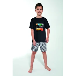 Dětské pyžamo ušité z vysoce kvalitní bavlny. Tričko s krátkým rukávem zdobené potiskem, doplněné krátkými vzorovanými šortkami. Pyžamo zabalené do fólie.