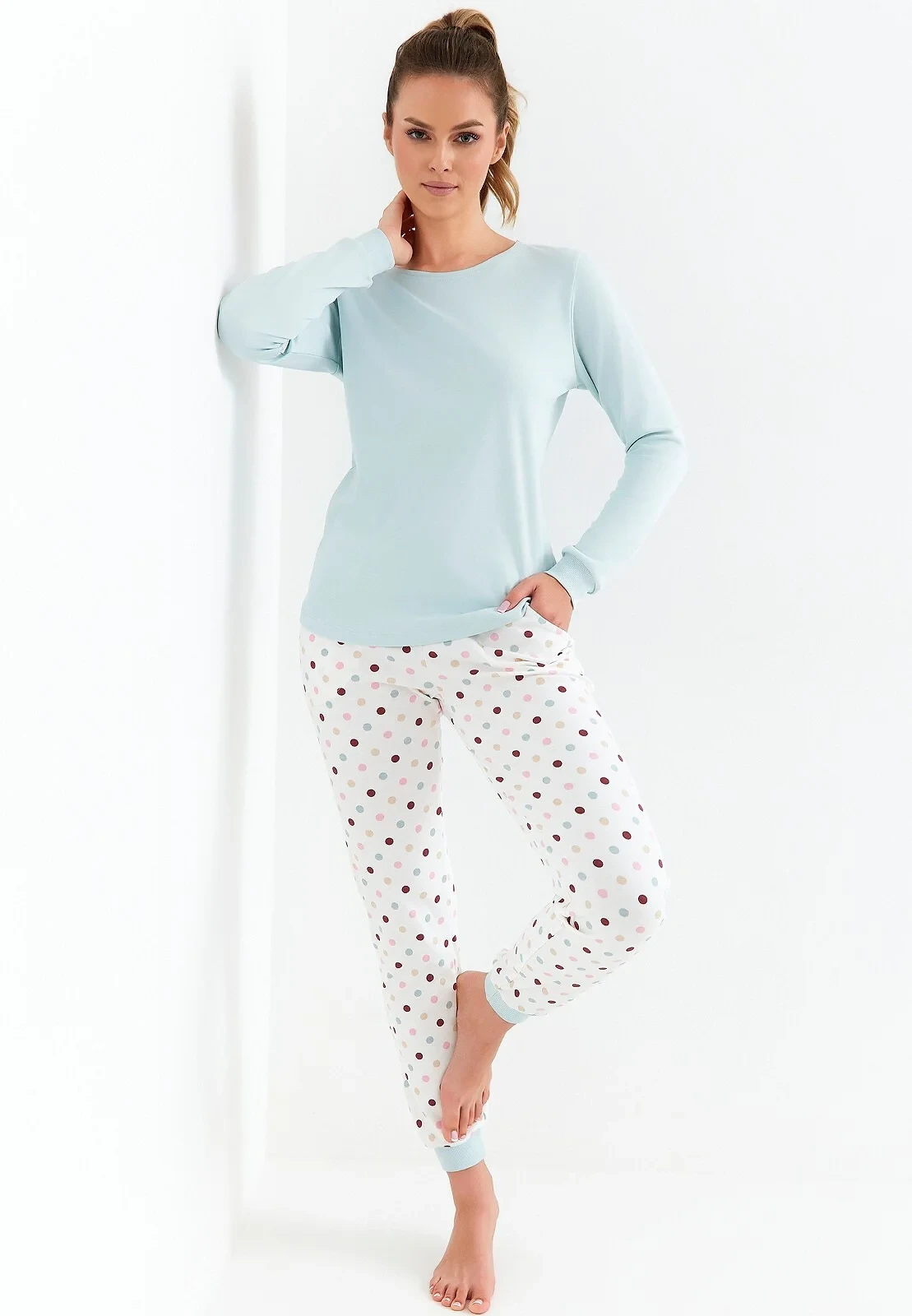 - dlouhé kalhoty s puntíkovaným vzorem