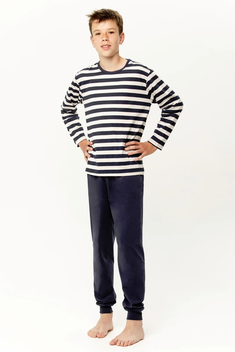 Chlapecké pyžamo s dlouhými rukávy, pruhované, s dlouhými pevnými kalhotami se švy.