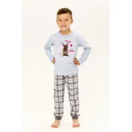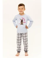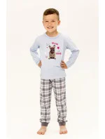 Chlapecké pyžamo z kvalitní bavlny. Tričko s dlouhými rukávy zdobené potiskem. Dlouhé kostkované kalhoty se stahovací šňůrkou v pase a pohodlnou gumou
