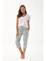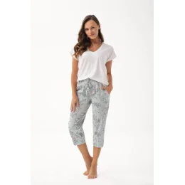 Mladé dámské pyžamo značky Luna, 3/4 dlouhé kalhoty s potiskem, v pase zdobené šňůrkami, kapsy. Jednobarevné, lodičkový výstřih, krátké rukávy.