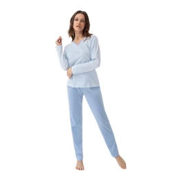 Dámské pyžamo s dlouhými rukávy z jemné bavlny s proužky, výstřihem s mírným rozparkem a odpovídajícími pevnými dlouhými kalhotami s rovnými nohavicemi.