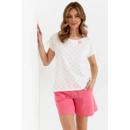 Urocza i komfortowa piżama damska w delikatnym, kobiecym stylu. Wykonana z wysokogatunkowego singla jersey z dodatkiem elastanu, zapewnia doskonałą miękkość i przewiewność. Bluzka w kolorze écru ozdobiona jest subtelnym wzorem drobnych różowych kropek. Oversizowy krój gwarantuje pełną swobodę ruchów, a krótkie rękawy i okrągły, starannie odszywany dekolt z haftowanym kwiatkiem z tiulu dodają uroku. Do kompletu dołączone są dłuższe spodenki w kolorze różowym, wyposażone w praktyczne kieszenie. To połączenie wygody i stylu, idealne na spokojne noce i leniwe poranki.