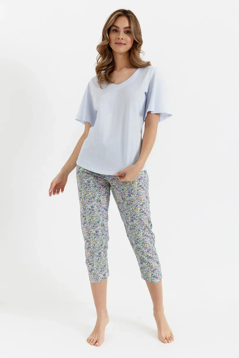 Model se vyznačuje krátkými rukávy a nohavicemi v délce 7/8, takže je ideální volbou jak pro teplejší noci, tak jako pohodlné domácí oblečení. Praktické kapsy dodávají funkčnost a umožňují uložení drobných předmětů. Díky decentnímu, ženskému designu vypadá pyžamo stylově a zároveň poskytuje maximální pohodlí.