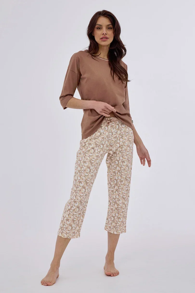 Dámské pyžamo s 3/4 dlouhými rukávy, z pevné bavlny, kulatý výstřih, 3/4 dlouhé vzorované kalhoty, ozdobná mašle v pase. Baleno v krabici.