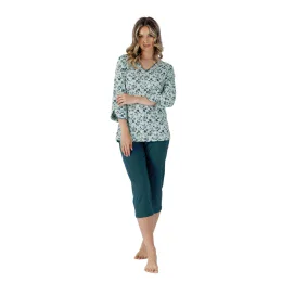 Dámské pyžamo se vzorovaným výstřihem a 3/4 rukávy. Komplet doplňují pevné kalhoty ve 3/4 délce.