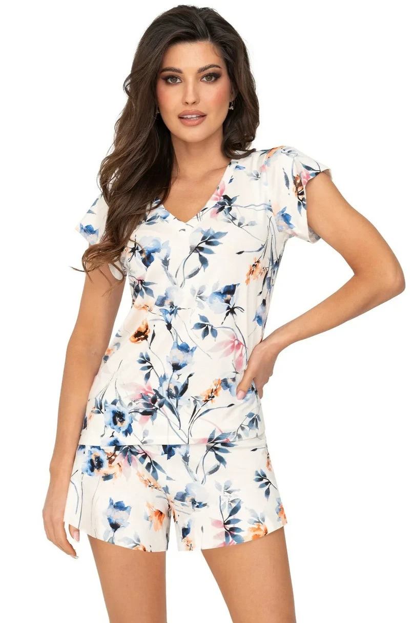 Viskózové dámské pyžamo s krátkými rukávy a krátkými šortkami. Pyžamo zdobí barevný květinový vzor, výstřih ve tvaru písmene "V".