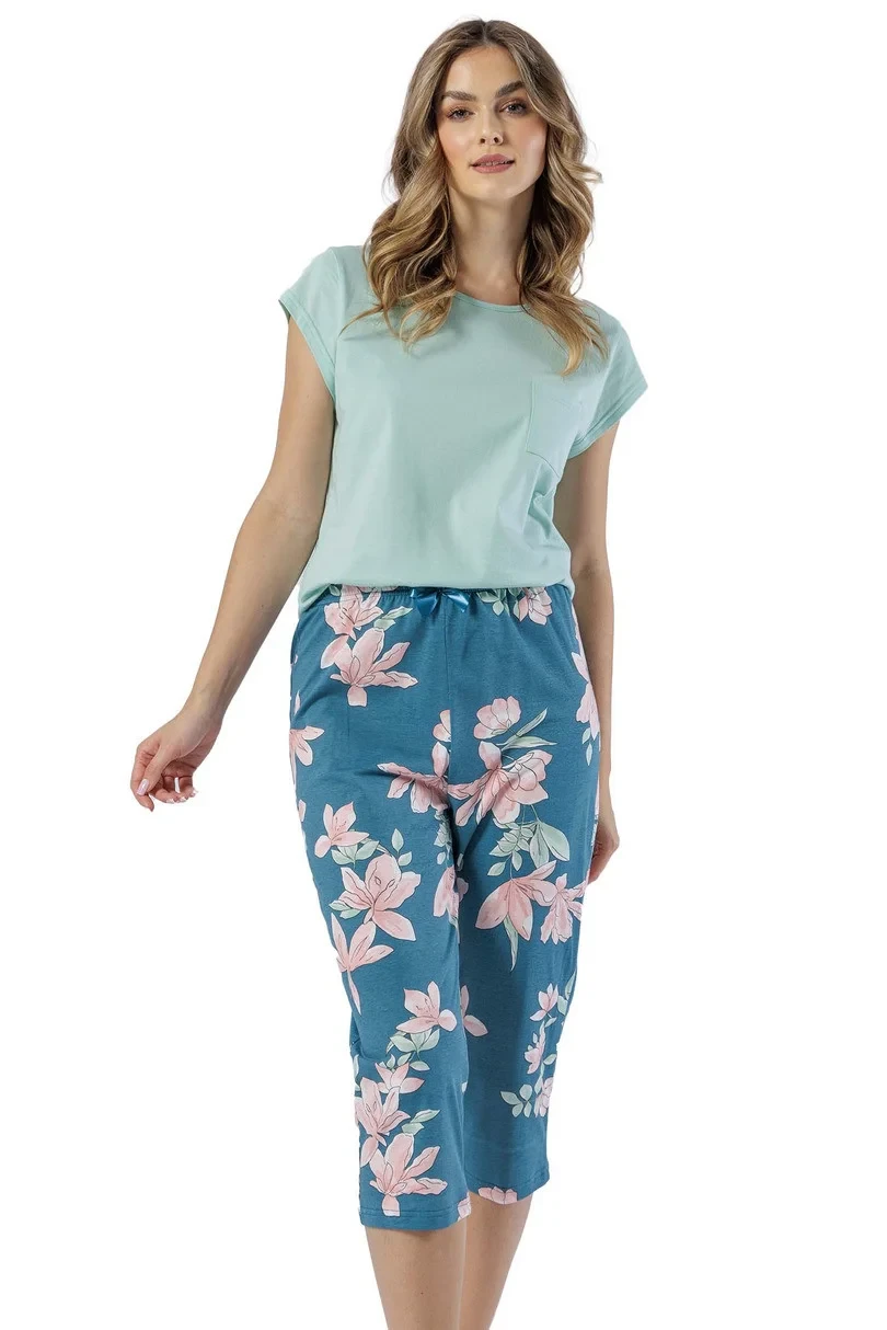 Dámské pyžamo s krátkým rukávem z měkké bavlny, kulatý výstřih, přední náprsní kapsa, vzorované 3/4 dlouhé kalhoty s ozdobnou mašlí v pase.