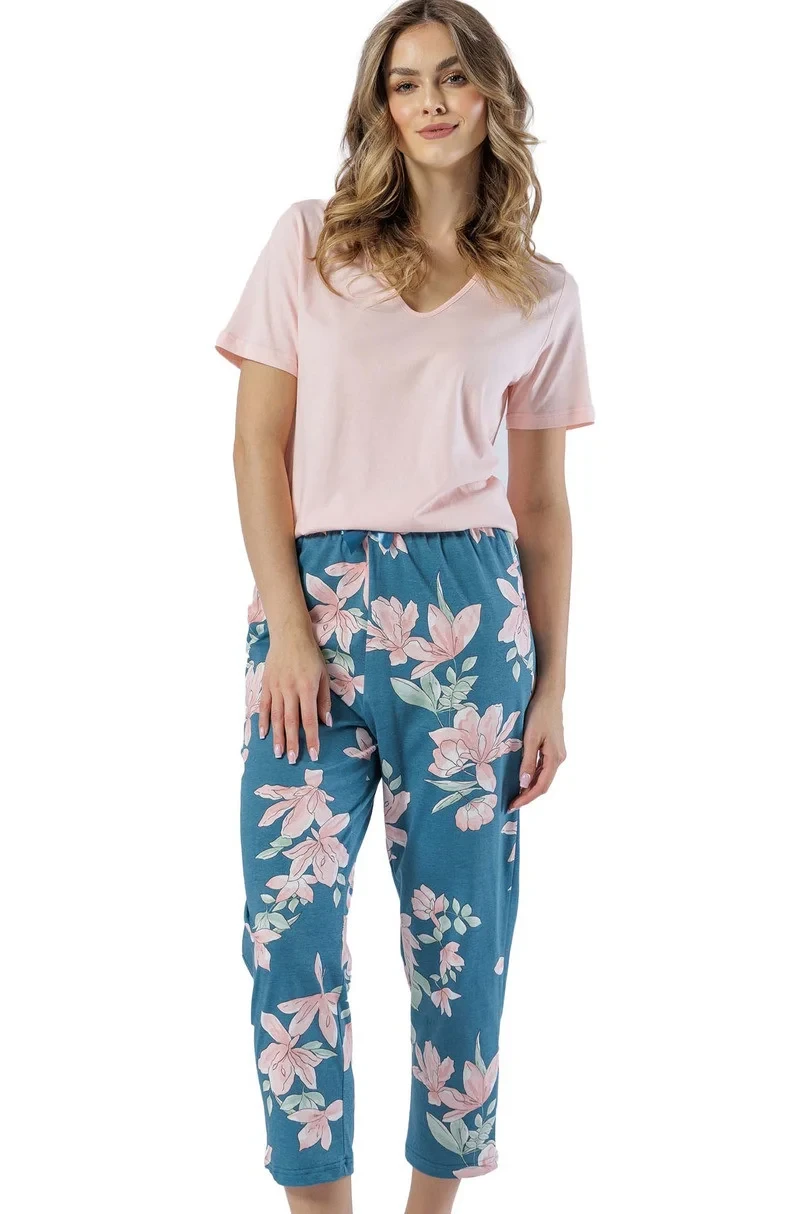 Dámské pyžamo s krátkými rukávy, vyrobené z měkké bavlny, s výstřihem do V. Vzorované kalhoty v délce 7/8, s ozdobnou mašlí v pase.