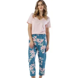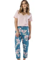 Dámské pyžamo s krátkým rukávem z měkké bavlny s výstřihem, vzorovanými kalhotami v délce 7/8 s ozdobnou mašlí v pase.
