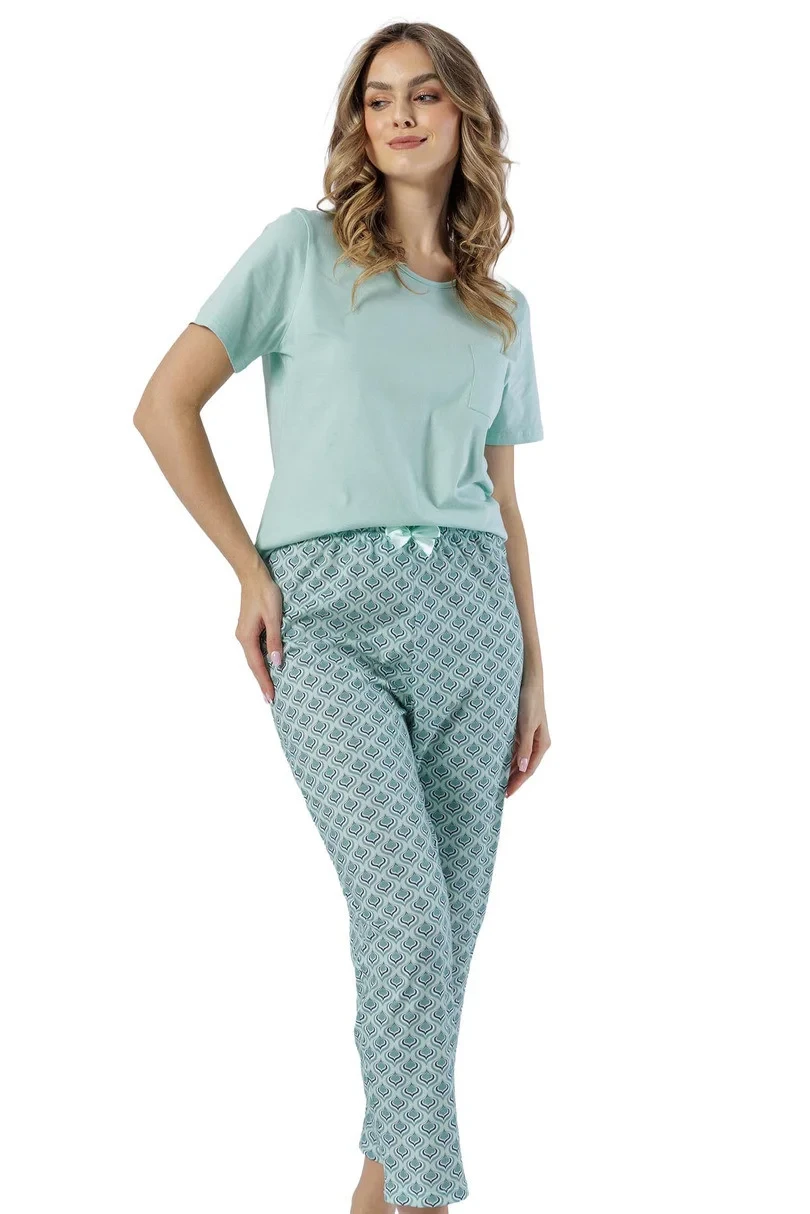 Dámské pyžamo s krátkým rukávem, vyrobené z bavlny v barvě pisattuja. Náprsní kapsa. 7/8 dlouhé kalhoty s ozdobnou mašlí v pase.