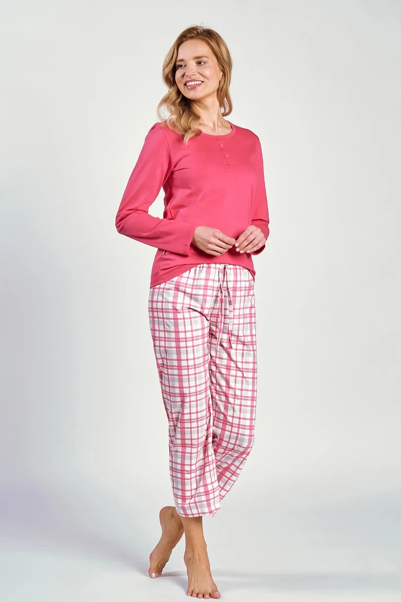 Dámské pyžamo s dlouhými rukávy, hladké, s knoflíky na prsou, vzorované kalhoty se 7/8 délky nohavic.