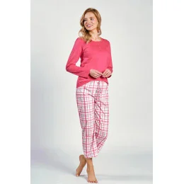 Dámské pyžamo s dlouhými rukávy, jednobarevné, s knoflíky v úrovni hrudníku. Vzorované kalhoty se 7/8 délkou nohavic.