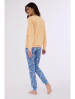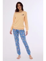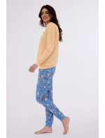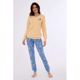 Dámské pyžamo z jemné bavlny. Halenka s dlouhými rukávy a žebrovanými manžetami, kulatý výstřih, jemný potisk na prsou, vzorované dlouhé kalhoty s žebrovanými manžetami, baleno v krabici.