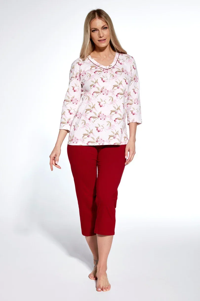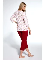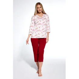 Dámské pyžamo ušité z vysoce kvalitní měkké bavlny. Tričko s 3/4 rukávy , vzorované serpézou. Doplňují je pevné kalhoty s rovnými nohavicemi v délce 7/8. Pyžamo zabalené v krabici.