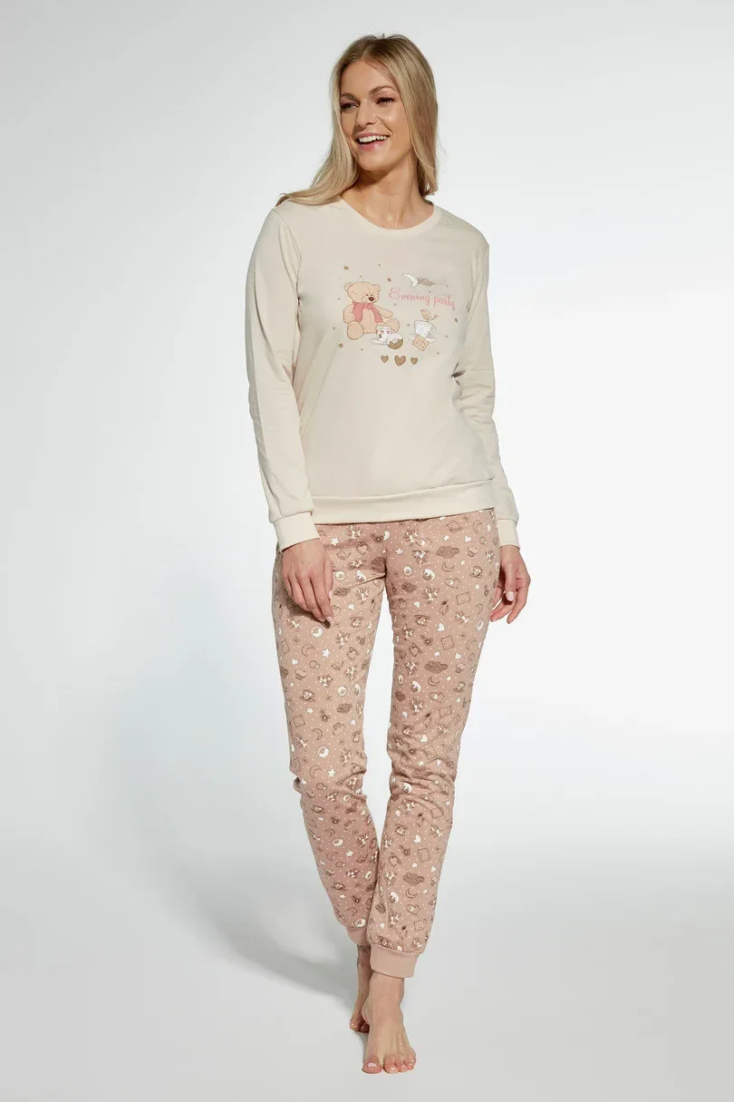 Dámské pyžamo z vysoce kvalitní měkké bavlny. Tričko s dlouhými rukávy, vpředu zdobené barevným potiskem, dlouhé vzorované kalhoty. Výstřih, manžety a spodní část trička a nohavic jsou zakončeny příjemným žebrováním. Pyžamo balené v krabici.