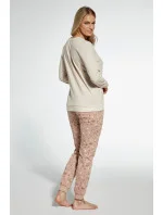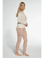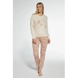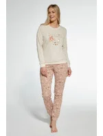 Dámské pyžamo ušité z vysoce kvalitní měkké bavlny. Tričko s dlouhými rukávy, vpředu zdobené barevným potiskem. Doplněno dlouhými vzorovanými kalhotami. Výstřih, manžety a spodní část nohavic košile jsou zakončeny pohodlným žebrovaným lemem. Pyžamo zabalené v krabici.