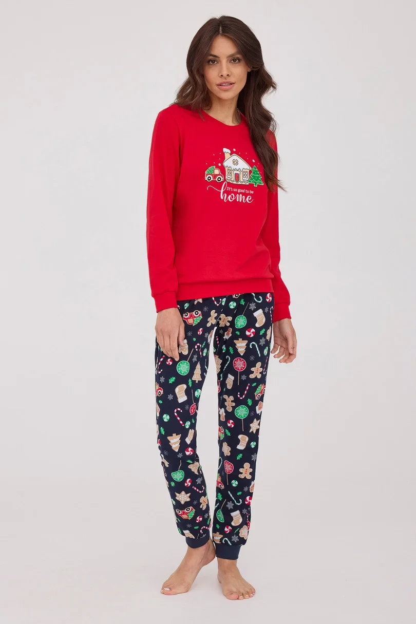 Dámské pyžamo z měkké bavlny, tričko s dlouhým rukávem a barevným potiskem na přední straně, dlouhé vzorované kalhoty s výstřihem, manžetami, lemem trička a nohavicemi s pohodlnou šňůrkou v pase. Pyžamo je baleno v krabici.